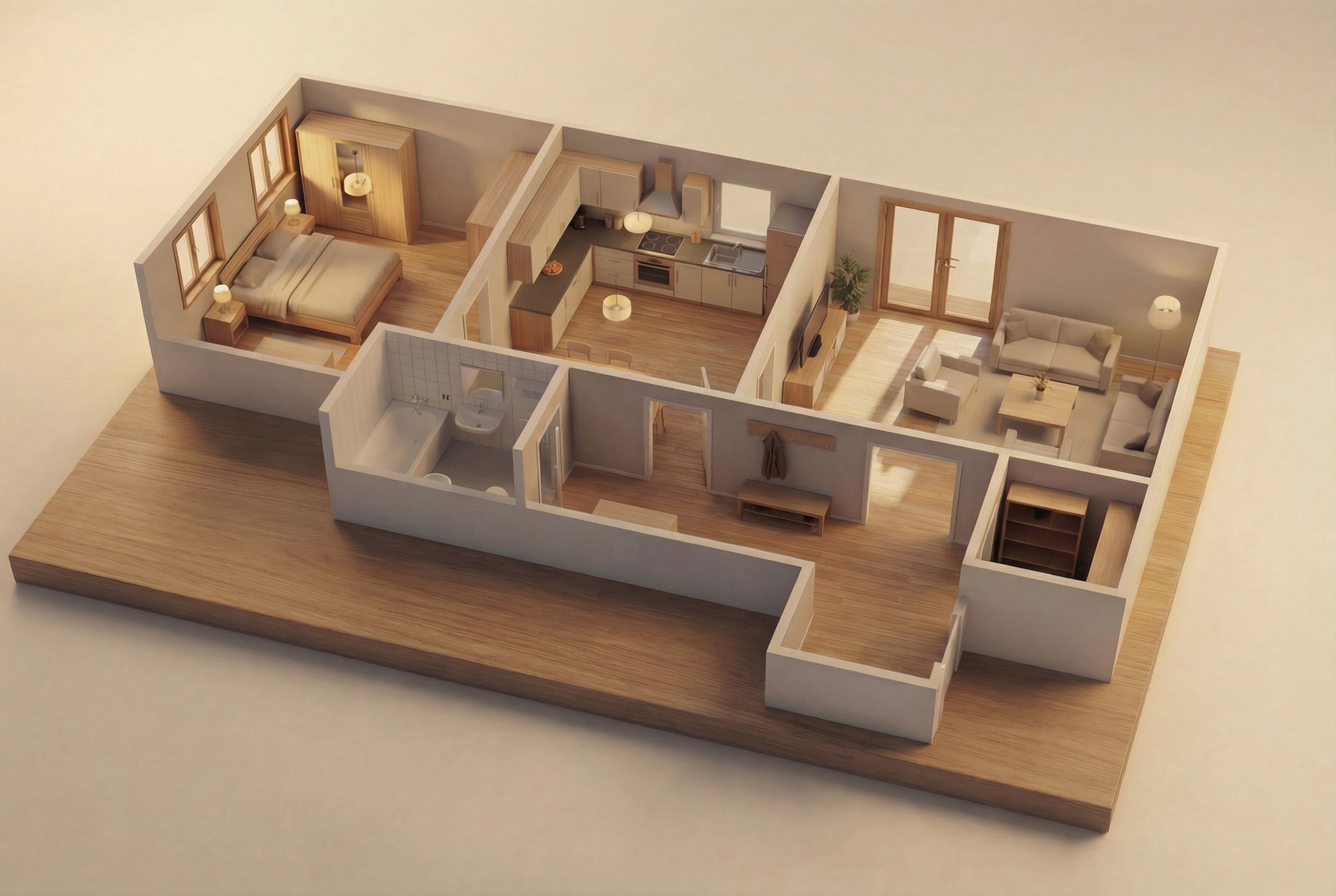 Wir verwandeln flache Grundrisse in immersive 3D-Visualisierungen — Layout, Maßstab und Potenzial auf einen Blick.